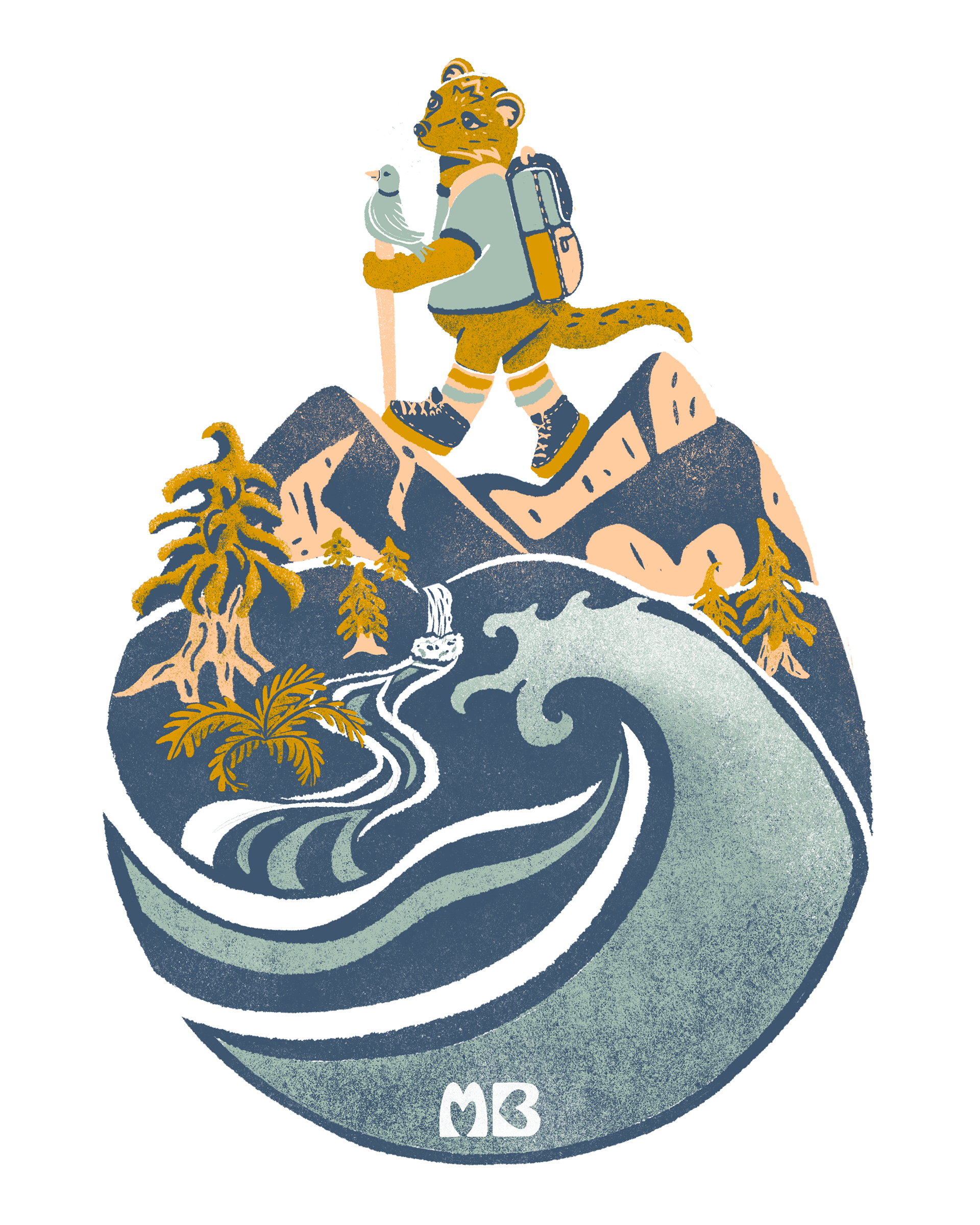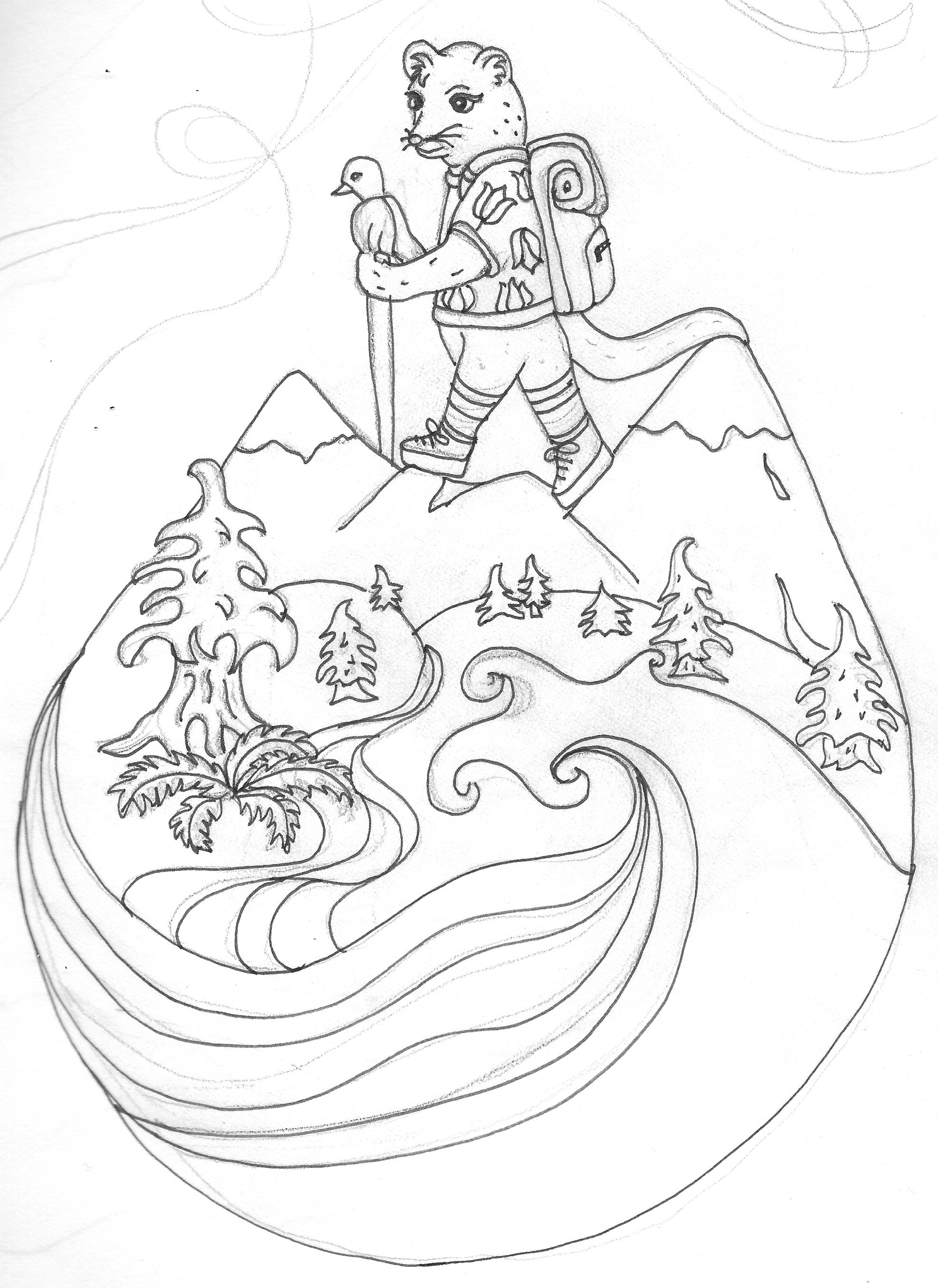 While exploring themes inspired by my local surroundings, hiking through the nearby mountains and forests emerged as a natural subject—one that I felt would resonate with local tourists. This illustration features the endangered fisher, a species native to the region.