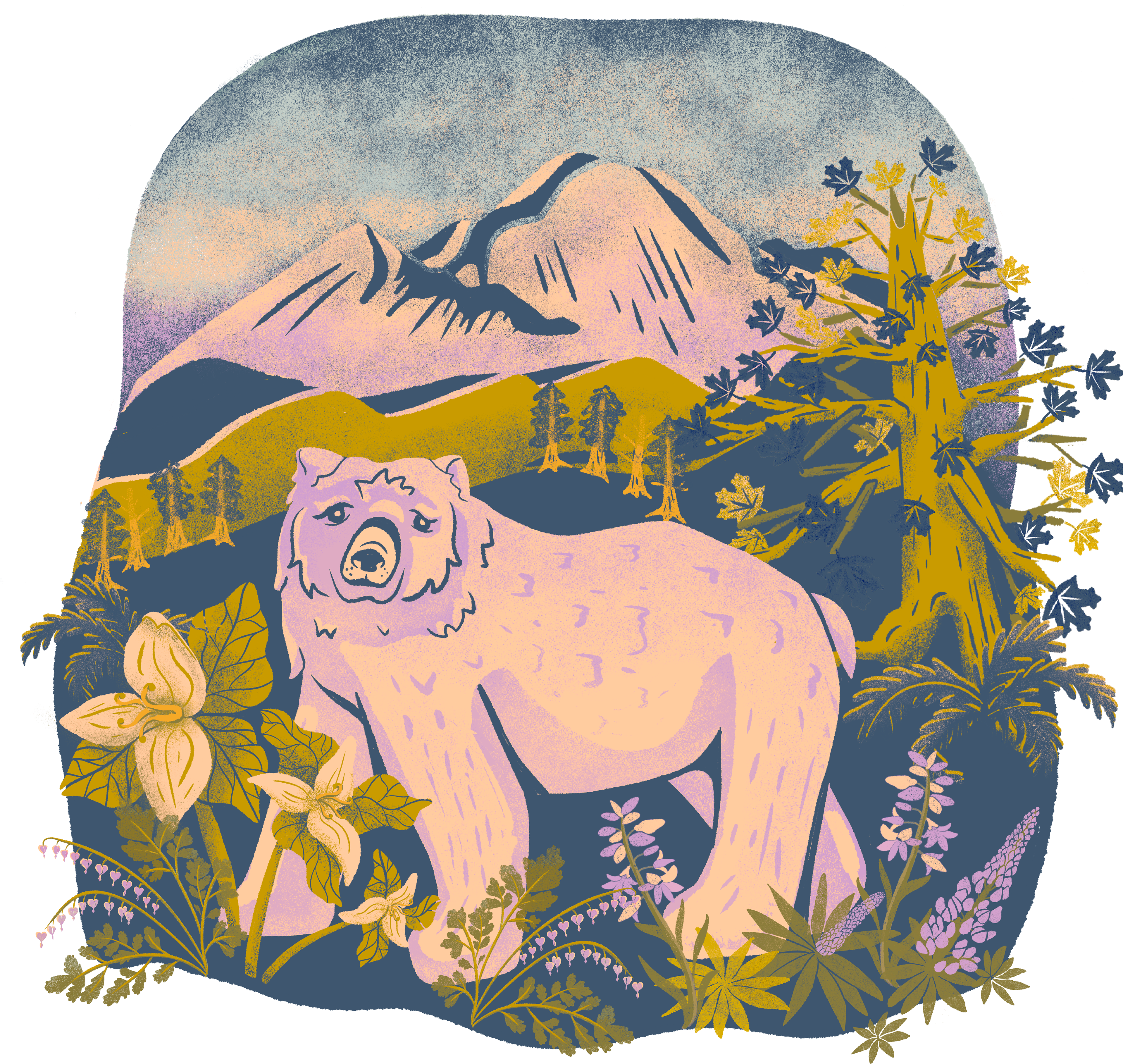 Inspired by local flora and fauna of the Pacific Northwest, this illustration began as a hand-drawn sketch and was further developed and rendered in Procreate. I used a limited color palette to maintain visual cohesion across this mini-collection, reflecting my preference for stylistic unity in nature-based work.